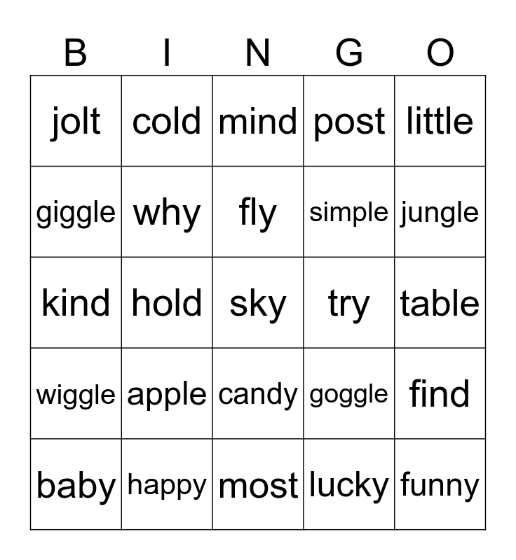 This bingo card has 25 words: apple, most, fly, baby, little, jolt, giggle, cold, try, candy, simple, kind, goggle, find, why, funny, table, mind, jungle, hold, sky, happy, wiggle, post and lucky.