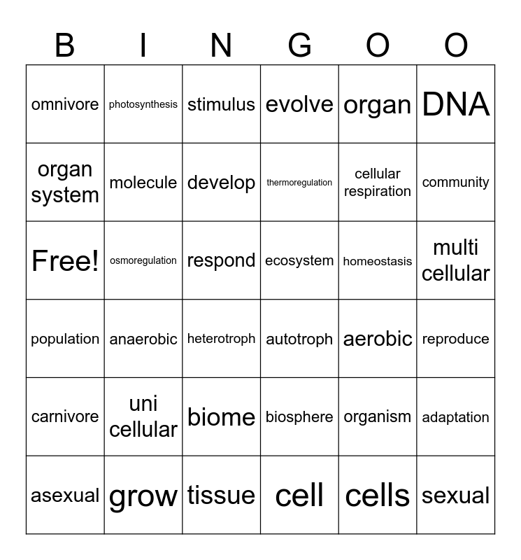 This bingo card has 36 words: biosphere, biome, cell, organ system, population, ecosystem, molecule, tissue, organ, organism, community, evolve, adaptation, osmoregulation, thermoregulation, omnivore, carnivore, homeostasis, Free!, stimulus, respond, anaerobic, autotroph, heterotroph, aerobic, photosynthesis, cellular respiration, grow, develop, DNA, sexual, asexual, reproduce, multi cellular, uni cellular and cells.
