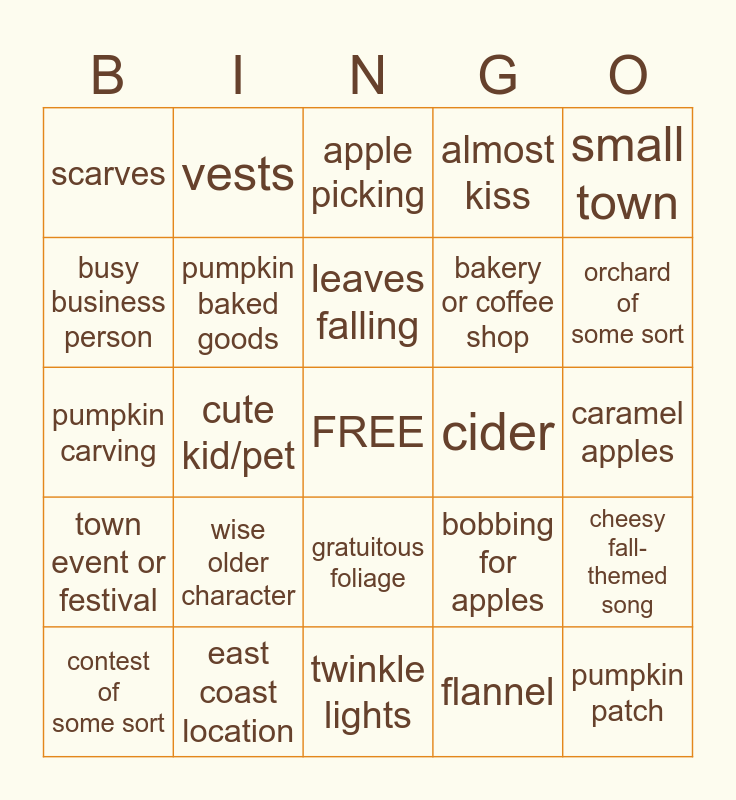 This bingo card has a free space and 24 words: wise older character, east coast location, leaves falling, contest of some sort, small town, scarves, busy business person, vests, cider, gratuitous foliage, bakery or coffee shop, pumpkin carving, bobbing for apples, cheesy fall-themed song, pumpkin baked goods, flannel, caramel apples, apple picking, orchard of some sort, cute kid/pet, pumpkin patch, town event or festival, almost kiss and twinkle lights.