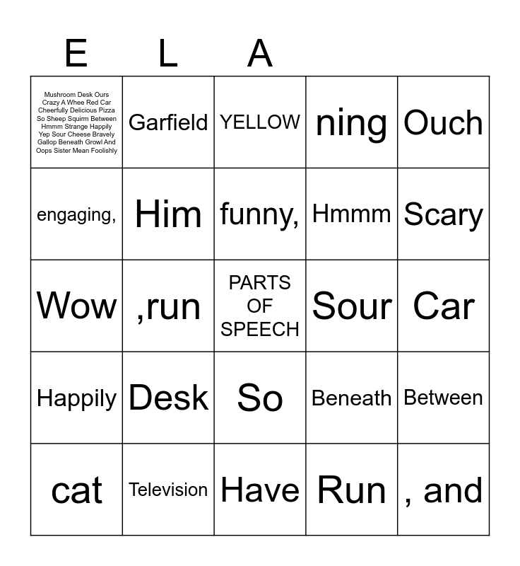 This bingo card has a free space and 74 words: BALL, IT, YELLOW, BADLY, BUT, TO, SCREAM, YAY!, cat, bicycle, Taylor Swift, Kuala Lumpur, funny,, engaging,, well-written, ,run, Book, Scary, Banana, Wow, Him, Garfield, ning, , winning, , and, being, amazing., Slowly, Under, And, Ouch, Pretty, An, Dog, Lovely, Run, Is, Batman, In, Quickly, Have, Television, You, Caterpillar, But, Mushroom Desk Ours Crazy A Whee Red Car Cheerfully Delicious Pizza So Sheep Squirm Between Hmmm Strange Happily Yep Sour Cheese Bravely Gallop Beneath Growl And Oops Sister Mean Foolishly, Mushroom, Desk, Ours, Crazy, A, Red, Car, Cheerfully, Delicious, Pizza, So, Sheep, Squirm, Between, Hmmm, Strange, Happily, Yep, Sour, Cheese, Bravely, Gallop, Beneath, Growl, Oops, Sister, Mean and Foolishly.