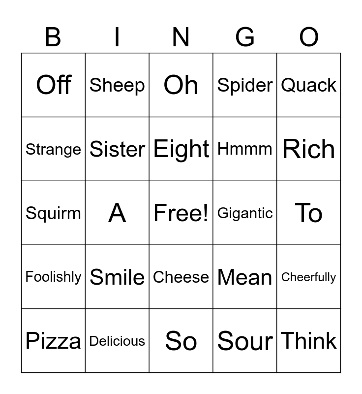 This bingo card has a free space and 36 words: Growl, And, Oops, Sister, Mean, Foolishly, Eight, Into, Quack, For, A, Spider, Songs, Gigantic, Rich, Off, Screech, Smile, Think, Oh, To, Cheerfully, Delicious, Pizza, So, Sheep, Squirm, Between, Hmmm, Strange, Happily, Yep, Sour, Cheese, Bravely and Gallop.