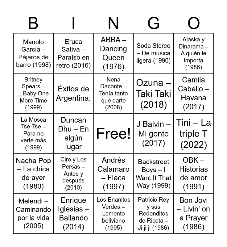 This bingo card has a free space and 97 words: Héroes del Silencio – Entre dos tierras, Mecano – Hijo de la luna, La Unión – Lobo-hombre en París, Duncan Dhu – En algún lugar, Alejandro Sanz – Corazón partío, El Canto del Loco – Zapatillas, Estopa – La raja de tu falda, La Oreja de Van Gogh – Rosas (2004), David Bisbal – Bulería (2004), Rosalía – Con altura (2019), Pablo Alborán – Solamente tú (2010), Amaral – Cómo hablar (1997), Jarabe de Palo – La flaca (1996), Nacha Pop – La chica de ayer (1980), Los Secretos – Déjame (1980), Manolo García – Pájaros de barro (1998), Alaska y Dinarama – A quién le importa (1986), Vetusta Morla – Copenhague (2008), SFDK – Todo lo que importa (2020), Bebe – Malo (2004), Danza Invisible – Sabor de amor (1988), Rafaella Carrá – En el amor todo es empezar (1983), C. Tangana – Tú me dejaste de querer (2020), Love of Lesbian – El poeta Halley (2016), Los Planetas – Un buen día (2000), Nena Daconte – Tenía tanto que darte (2008), Melendi – Caminando por la vida (2005), OBK – Historias de amor (1991), Antonio Orozco – Estoy hecho de pedacitos de ti (2004), Los Rebeldes – Mediterráneo (1988), Éxitos de Argentina:, Soda Stereo – De música ligera (1990), Charly García – Rezo por vos (1985), Fito Páez – Mariposa tecknicolor (1994), Los Enanitos Verdes – Lamento boliviano (1995), Andrés Calamaro – Flaca (1997), Gustavo Cerati – Crimen (2006), Los Fabulosos Cadillacs – Matador (1993), Babasónicos – Yegua (2001), La Mosca Tse-Tse – Para no verte más (1999), Abel Pintos – Motivos (2007), Tini – La triple T (2022), Miranda! – Don (2004), Patricio Rey y sus Redonditos de Ricota – Ji ji ji (1986), Ciro y Los Persas – Antes y después (2010), Attaque 77 – Hacelo por mí (1993), Illya Kuryaki and the Valderramas – Abarajame (1995), Luis Alberto Spinetta – Seguir viviendo sin tu amor (1991), Vicentico – Los caminos de la vida (2005), La Beriso – Cómo olvidarme (2018), Indio Solari – Flight 956 (2010), Soledad Pastorutti – Que nadie sepa mi sufrir (1997), Lali – LALIGERA (2019), Los Pericos – Runaway (1997), Rata Blanca – La leyenda del hada y el mago (1990), Damas Gratis – Los dueños del pabellón (2000), Airbag – Cae el sol (2011), Eruca Sativa – Paraíso en retro (2016), Axel – Te voy a amar (2005), La Vela Puerca – Zafar (2004), María Becerra – Ojalá (2022), Éxitos Hispano-Latinos:, Shakira – Hips Don't Lie (2006), Luis Fonsi – Despacito (2017), Ricky Martin – Livin' la vida loca (1999), Marc Anthony – Vivir mi vida (2013), Carlos Vives – La bicicleta (2016), Daddy Yankee – Gasolina (2004), Juanes – La camisa negra (2005), Enrique Iglesias – Bailando (2014), Ozuna – Taki Taki (2018), Celia Cruz – La vida es un carnaval (1998), Don Omar – Danza Kuduro (2010), Maluma – Felices los 4 (2017), Thalía – Amor a la mexicana (1997), Bad Bunny – Callaíta (2019), Anitta – Envolver (2021), Becky G – Mayores (2017), J Balvin – Mi gente (2017), Nicky Jam – El perdón (2015), Rosalía – Motomami (2022), Camila Cabello – Havana (2017), Michael Jackson – Billie Jean (1982), Madonna – Like a Prayer (1989), Queen – Bohemian Rhapsody (1975), Whitney Houston – I Will Always Love You (1992), Bon Jovi – Livin' on a Prayer (1986), Prince – Purple Rain (1984), Cyndi Lauper – Girls Just Want to Have Fun (1983), Bee Gees – Stayin' Alive (1977), ABBA – Dancing Queen (1976), Elton John – Rocket Man (1972), Spice Girls – Wannabe (1996), Backstreet Boys – I Want It That Way (1999), Britney Spears – ...Baby One More Time (1999), A-ha – Take On Me (1985) and David Bowie – Let’s Dance (1983).