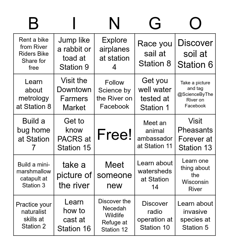 This bingo card has a free space and 24 words: take a picture of the river, Learn how to cast at Station 16, Follow Science by the River on Facebook, Practice your naturalist skills at Station 2, Discover soil at Station 6, Rent a bike from River Riders Bike Share for free, Learn about metrology at Station 8, Jump like a rabbit or toad at Station 9, Meet an animal ambassador at Station 11, Meet someone new, Get you well water tested at Station 1, Build a bug home at Station 7, Learn about watersheds at Station 14, Learn one thing about the Wisconsin River, Visit the Downtown Farmers Market, Discover radio operation at Station 10, Visit Pheasants Forever at Station 13, Explore airplanes at station 4, Take a picture and tag @ScienceByThe River on Facebook, Get to know PACRS at Station 15, Learn about invasive species at Station 5, Build a mini-marshmallow catapult at Station 3, Race you sail at Station 8 and Discover the Necedah Wildlife Refuge at Station 12.