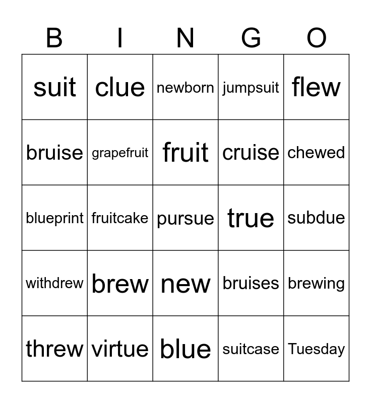 This bingo card has 25 words: brew, blue, fruit, threw, flew, suit, bruise, clue, true, new, cruise, blueprint, bruises, brewing, grapefruit, Tuesday, subdue, newborn, chewed, fruitcake, pursue, virtue, withdrew, jumpsuit and suitcase.