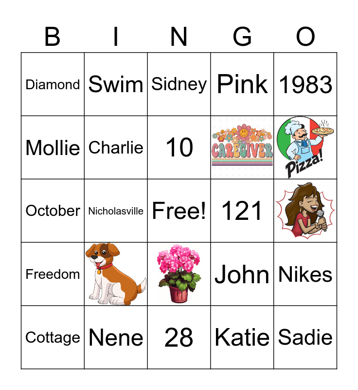 This bingo card has 5 images, a free space and 19 words: Nene, 10, Cottage, 1983, Diamond, Mollie, Swim, 121, October, John, Nikes, Charlie, Katie, Sidney, Nicholasville, Sadie, Freedom, Pink and 28.