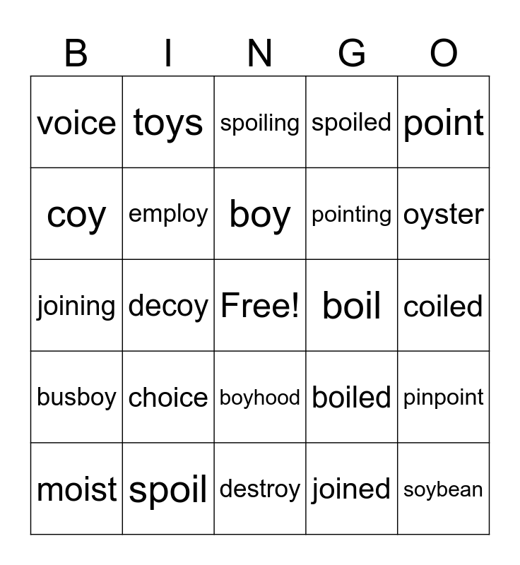 This bingo card has a free space and 24 words: choice, spoil, boy, moist, point, voice, coy, toys, boil, boyhood, pointing, joining, boiled, pinpoint, employ, joined, coiled, spoiling, oyster, decoy, soybean, busboy, spoiled and destroy.