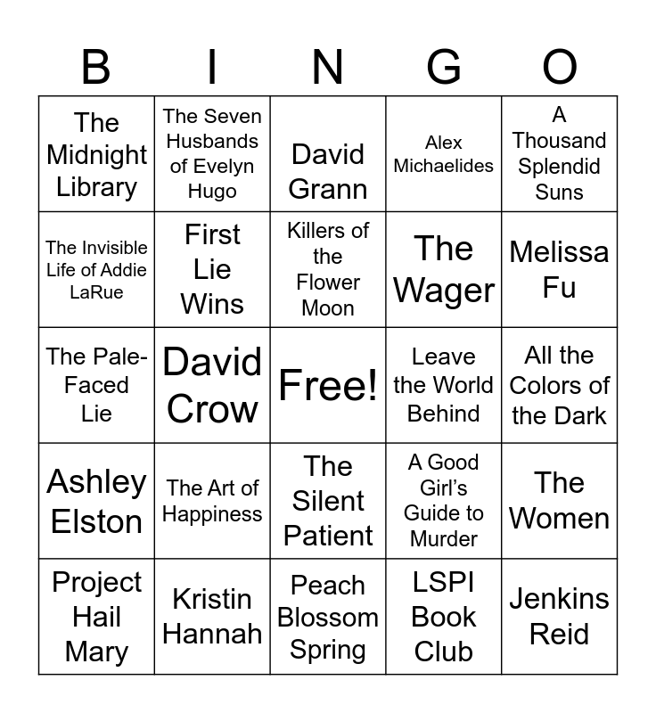 This bingo card has a free space and 25 words: The Art of Happiness, Peach Blossom Spring, Killers of the Flower Moon, Project Hail Mary, A Thousand Splendid Suns, The Midnight Library, The Invisible Life of Addie LaRue, The Seven Husbands of Evelyn Hugo, Leave the World Behind, The Silent Patient, The Wager, The Pale-Faced Lie, A Good Girl’s Guide to Murder, The Women, First Lie Wins, The September House, All the Colors of the Dark, David Grann, Melissa Fu, David Crow, Jenkins Reid, Kristin Hannah, Ashley Elston, Alex Michaelides and LSPI Book Club.