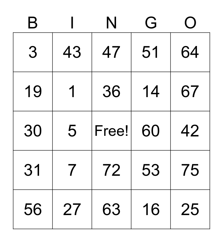 This bingo card has a free space and 24 words: 7, 27, 36, 56, 64, 3, 19, 43, 60, 72, 14, 30, 53, 75, 1, 16, 42, 47, 67, 5, 25, 31, 51 and 63.