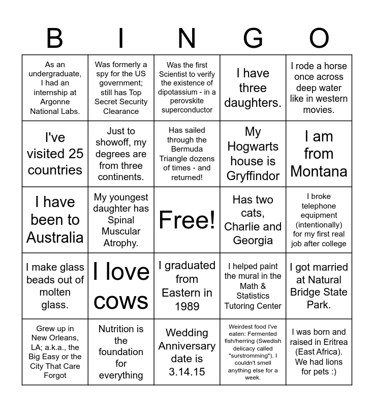 This bingo card has a free space and 49 words: I have 12 cats., I was born and raised in Eritrea (East Africa). We had lions for pets :), I have a dog named Valorie., Wedding Anniversary date is 3.14.15, I love cows, I'm descendent from a witch convicted in the Salem Witch Trials, Was formerly a spy for the US government; still has Top Secret Security Clearance, Broke my foot in graduate school, I've visited 25 countries, I have four grandchildren., Just to showoff, my degrees are from three continents., I have three daughters., I got married at Natural Bridge State Park., I helped paint the mural in the Math & Statistics Tutoring Center, I have 2 young kids, I have played harp for a former Prime Minister of England, Has sailed through the Bermuda Triangle dozens of times - and returned!, Has two cats, Charlie and Georgia, I was a member of the first Kentucky Governors Scholars class in 1983, I rode a horse once across deep water like in western movies., My youngest daughter has Spinal Muscular Atrophy., Weirdest food I've eaten: Fermented fish/herring (Swedish delicacy called "surstromming"). I couldn't smell anything else for a week., As an undergraduate, I had an internship at Argonne National Labs., My Hogwarts house is Gryffindor, I show horses, I am from Montana, Grew up in New Orleans, LA; a.k.a., the Big Easy or the City That Care Forgot, Wife is also a professor, I graduated from Eastern in 1989, I make glass beads out of molten glass., I am Past President of Mu Sigma Rho, the national statistics honorary society., I love rocks! What more would you expect from geologist? :), I like to play Dungeons and Dragons., I can rap the quadratic formula, Nutrition is the foundation for everything, I had a pet rabbit as a child, Endorses RC Cola as THE cola for chemists, Is from US Gulf Coast, I broke telephone equipment (intentionally) for my first real job after college, My rival high school's colors were maroon and white, so I never wore maroon until I started working at EKU., I was a Goldwater Scholar., I give talks on the science of Gerrymandering and drawing voting districts., Speaking of pi, my daughter was born at 3:14AM, I am a cowboy, I have been to Australia, Was the first Scientist to verify the existence of dipotassium - in a perovskite superconductor, Has a collection of over 100 board games, I lived in Texas for 25 years and If I had to change jobs and not work in higher education anymore, I would want to be a sports broadcaster..