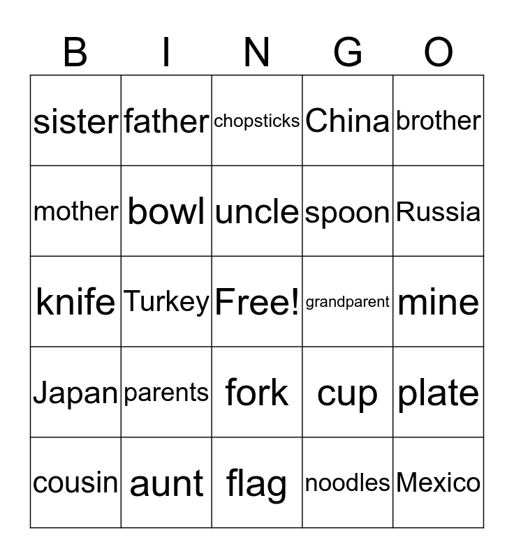 This bingo card has a free space and 24 words: parents, aunt, uncle, cousin, brother, sister, mother, father, grandparent, fork, spoon, knife, cup, plate, bowl, noodles, mine, chopsticks, Russia, Turkey, Mexico, Japan, China and flag.