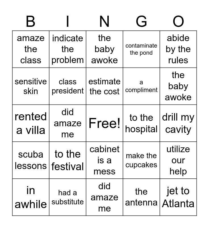 This bingo card has a free space and 29 words: in awhile, bring her umbrella, did amaze me, have extra time, amaze the class, the baby awoke, class president, to the festival, to the hospital, had a substitute, drill my cavity, jet to Atlanta, did amaze me, the antenna, the baby awoke, frozen tundra, cabinet is a mess, scuba lessons, abide by the rules, rented a villa, make the cupcakes, abide by rules, a compliment, sensitive skin, contaminate the pond, indicate the problem, utilize our help, estimate the cost and ventilate the attic.