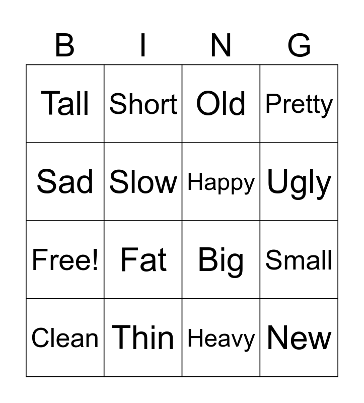This bingo card has 20 words: Small, Long, Old, Fast, Clean, Sad, Thin, Tall, Free!, Short, Fat, Big, Slow, New, Happy, Dirty, Ugly, Pretty, Heavy and Strong.