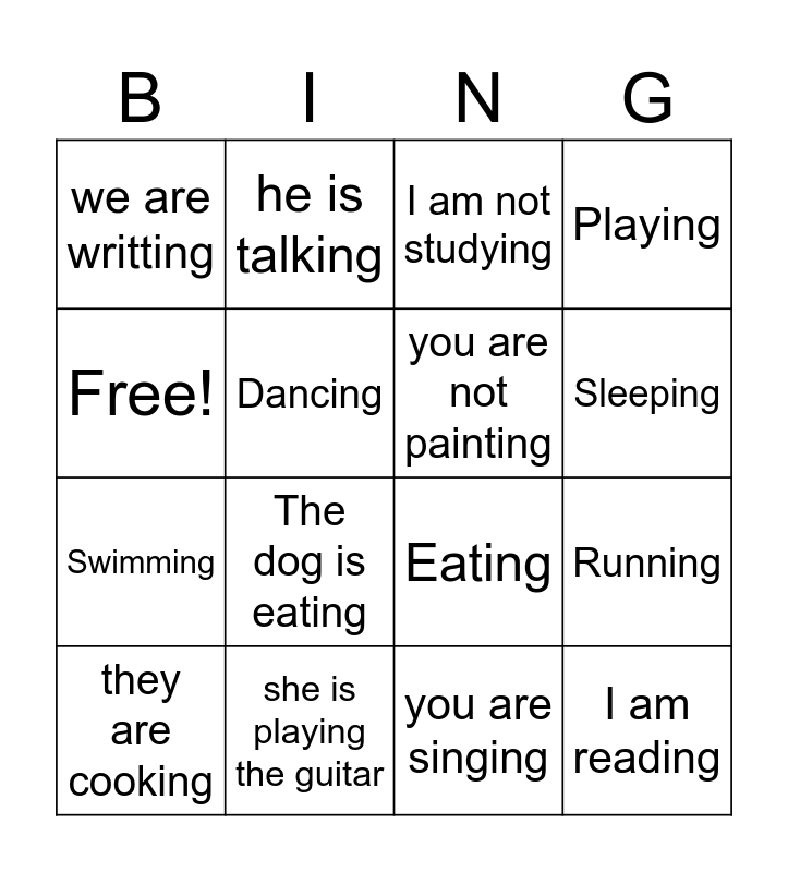 This bingo card has 16 words: she is playing the guitar, Running, I am not studying, we are writting, Swimming, he is talking, Eating, you are singing, Free!, Dancing, they are cooking, Playing, The dog is eating, Sleeping, you are not painting and I am reading.