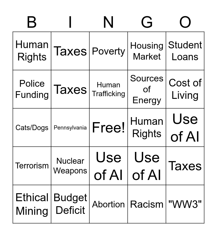 This bingo card has a free space and 323 words: Healthcare Affordability, Joe Biden, Gun Violence, Police Funding, Social Media, Gaza Strip, Trade Policy, Abortion, LGBTQ+, Cost of Living, Sources of Energy, Marriage, Racism, Unemployment, Fraudulent Elections, Criminal Justice Reform, Immigration, Ethical Mining, Nuclear Weapons, Human Rights, Homeless, Small businesses, Cyber Issues, Patriotism, Middle-class, Human Trafficking, Russo-Ukrainian War, Taxes, Inflation, Mental Health, Defense spending, Springfield, OH, Use of AI, Poverty, Drug addiction, Quality of Infrastructure, Budget Deficit, "WW3", Department of Education, Covid-19, Anti-Corruption, Homeless, Police Funding, Pennsylvania, Border, Cats/Dogs, Student Loans, Gun Violence, Climate Control, Abortion, Joe Biden, Marriage, Racism, Social Media, Small businesses, Unemployment, Nuclear Weapons, Sources of Energy, Housing Market, Crime rates, Ethical Mining, Springfield, OH, Human Rights, Criminal Justice Reform, Mental Health, Defense spending, Trade Policy, Healthcare Affordability, Russo-Ukrainian War, Terrorism, Patriotism, Homeless, Gun Violence, "WW3", Ethical Mining, Covid-19, Cats/Dogs, Immigration, LGBTQ+, Joe Biden, Use of AI, Student Loans, Abortion, Climate Control, Fraudulent Elections, Police Funding, Department of Education, Social Media, Budget Deficit, Quality of Infrastructure, Human Trafficking, Human Rights, Mental Health, Racism, Anti-Corruption, Small businesses, Healthcare Affordability, Inflation, Trade Policy, Taxes, Border, Defense spending, Middle-class, Marriage, Homeless, Russo-Ukrainian War, Crime rates, Covid-19, Fraudulent Elections, Mental Health, Sources of Energy, Gun Violence, Nuclear Weapons, LGBTQ+, Unemployment, Human Trafficking, Drug addiction, Anti-Corruption, Student Loans, Social Media, Use of AI, "Corrupt", Terrorism, Joe Biden, Budget Deficit, Poverty, Small businesses, Police Funding, Cyber Issues, Abortion, Department of Education, Marriage, Homeless, Healthcare Affordability, Patriotism, Border, Human Rights, Quality of Infrastructure, Trade Policy, Criminal Justice Reform, Pennsylvania, Racism, Sources of Energy, Springfield, OH, Cost of Living, Cats/Dogs, Russo-Ukrainian War, Gaza Strip, Gun Violence, Mental Health, LGBTQ+, Unemployment, Defense spending, Budget Deficit, Nuclear Weapons, Ethical Mining, "WW3", Taxes, Immigration, Climate Control, Anti-Corruption, Student Loans, Crime rates, Fraudulent Elections, Terrorism, Social Media, Joe Biden, Drug addiction, Human Rights, Healthcare Affordability, Inflation, Police Funding, Department of Education, Marriage, Sources of Energy, Housing Market, Small businesses, Human Trafficking, Pennsylvania, Springfield, OH, Use of AI, Mental Health, Patriotism, Unemployment, Poverty, Fraudulent Elections, Middle-class, Budget Deficit, Abortion, Covid-19, "Corrupt", Trade Policy, Gun Violence, Cats/Dogs, Social Media, LGBTQ+, Russo-Ukrainian War, Healthcare Affordability, Terrorism, Racism, Poverty, Human Rights, Sources of Energy, Pennsylvania, Joe Biden, Mental Health, Cost of Living, Ethical Mining, Border, Defense spending, Taxes, Unemployment, Cyber Issues, Springfield, OH, Department of Education, Climate Control, Abortion, Police Funding, Middle-class, Marriage, Patriotism, Housing Market, Criminal Justice Reform, Budget Deficit, Small businesses, Crime rates, Use of AI, Gun Violence, Healthcare Affordability, Drug addiction, Covid-19, Nuclear Weapons, Homeless, Fraudulent Elections, Ethical Mining, Trade Policy, Defense spending, Human Trafficking, "WW3", Cats/Dogs, Border, Human Rights, LGBTQ+, Anti-Corruption, Sources of Energy, Taxes, Russo-Ukrainian War, Healthcare Affordability, Springfield, OH, Gaza Strip, Mental Health, Cost of Living, "Corrupt", Social Media, Student Loans, Marriage, Human Trafficking, Poverty, Terrorism, Cyber Issues, Joe Biden, Abortion, Racism, Inflation, Police Funding, Nuclear Weapons, Trade Policy, Small businesses, Gun Violence, Use of AI, Patriotism, Defense spending, Covid-19, Department of Education, Quality of Infrastructure, Middle-class, Mental Health, Poverty, Criminal Justice Reform, LGBTQ+, Homeless, Taxes, Fraudulent Elections, Pennsylvania, Abortion, Sources of Energy, Drug addiction, Joe Biden, Marriage, Immigration, Human Rights, Cost of Living, Ethical Mining, Social Media, Mental Health, Healthcare Affordability, Patriotism, Human Trafficking, Inflation, Human Rights, "WW3", Middle-class, Mental Health, Fraudulent Elections, Terrorism, Abortion, Pennsylvania, Gun Violence, Covid-19, Racism, Ethical Mining, Small businesses, Springfield, OH, Healthcare Affordability, Patriotism, Trade Policy, Sources of Energy, Nuclear Weapons, Use of AI, Criminal Justice Reform, Budget Deficit, Human Trafficking and Cats/Dogs.