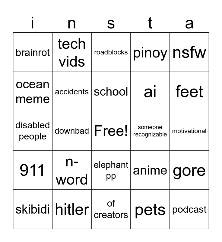 This bingo card has a free space and 24 words: n-word, hitler, school, skibidi, nsfw, brainrot, ocean meme, tech vids, someone recognizable, elephant pp, ai, disabled people, anime, gore, accidents, pets, motivational, roadblocks, feet, downbad, podcast, 911, pinoy and of creators.
