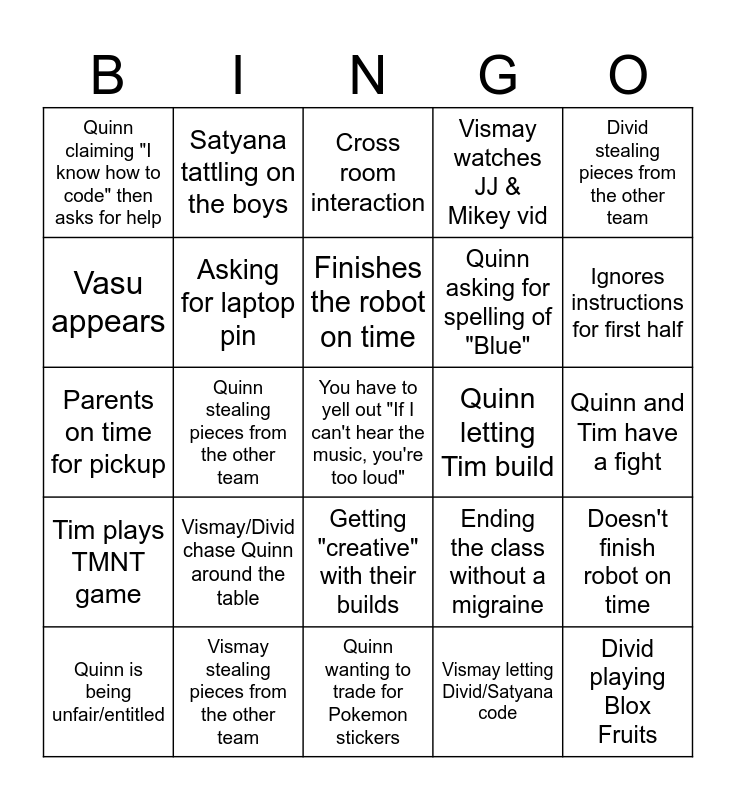 This bingo card has a free space and 24 words: Vismay/Divid chase Quinn around the table, Vismay stealing pieces from the other team, Finishes the robot on time, Quinn is being unfair/entitled, Divid stealing pieces from the other team, Quinn claiming "I know how to code" then asks for help, Vasu appears, Satyana tattling on the boys, Quinn letting Tim build, Getting "creative" with their builds, Quinn asking for spelling of "Blue", Parents on time for pickup, Ending the class without a migraine, Doesn't finish robot on time, Asking for laptop pin, Vismay letting Divid/Satyana code, Quinn and Tim have a fight, Cross room interaction, Ignores instructions for first half, Quinn stealing pieces from the other team, Divid playing Blox Fruits, Tim plays TMNT game, Vismay watches JJ & Mikey vid and Quinn wanting to trade for Pokemon stickers.