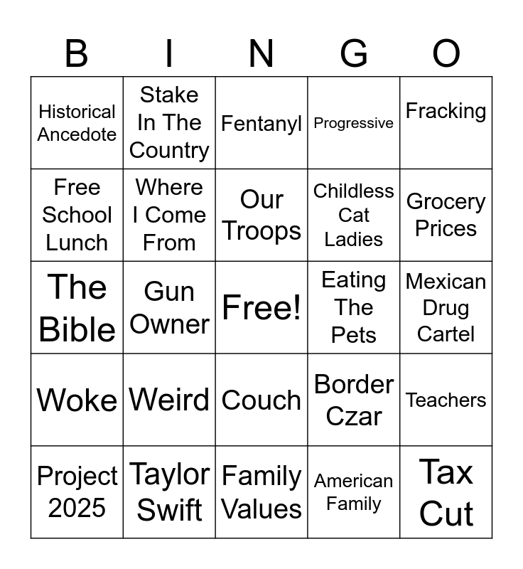 This bingo card has a free space and 24 words: Weird, Taylor Swift, Our Troops, Project 2025, Fracking, Historical Ancedote, Free School Lunch, Stake In The Country, Eating The Pets, Couch, Childless Cat Ladies, The Bible, Border Czar, Teachers, Where I Come From, American Family, Mexican Drug Cartel, Fentanyl, Grocery Prices, Gun Owner, Tax Cut, Woke, Progressive and Family Values.