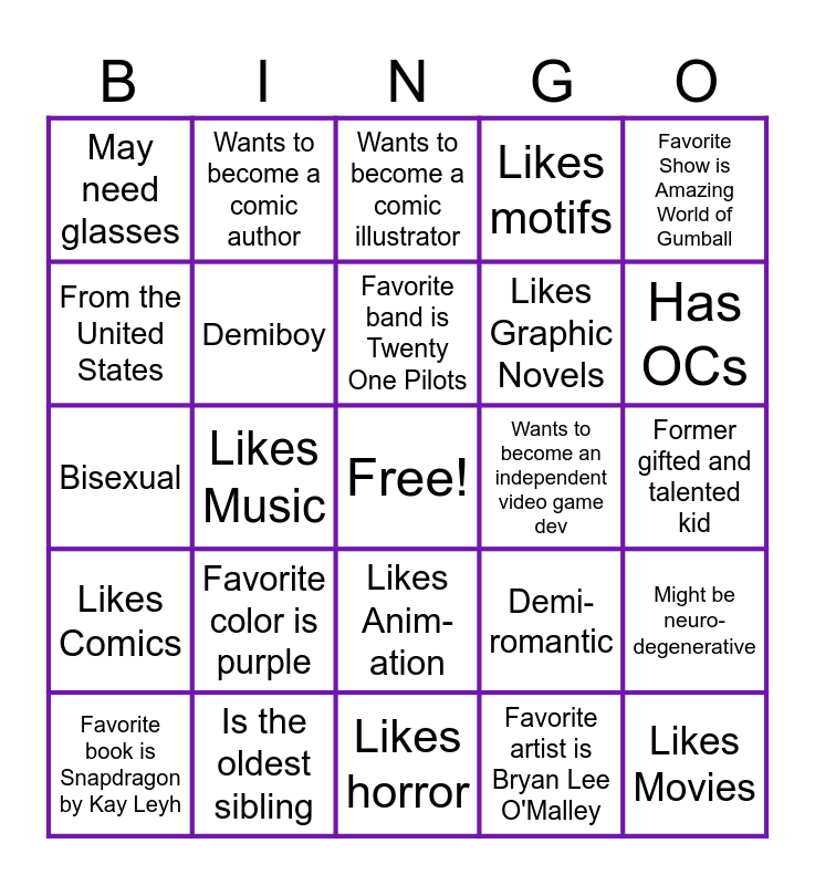 This bingo card has a free space and 24 words: Favorite book is Snapdragon by Kay Leyh, Favorite color is purple, Favorite band is Twenty One Pilots, Favorite artist is Bryan Lee O'Malley, Favorite Show is Amazing World of Gumball, May need glasses, Wants to become a comic author, Wants to become a comic illustrator, Wants to become an independent video game dev, Former gifted and talented kid, Bisexual, Demiboy, Demi-romantic, Might be neuro-degenerative, From the United States, Is the oldest sibling, Likes horror, Likes motifs, Has OCs, Likes Comics, Likes Music, Likes Anim-ation, Likes Graphic Novels and Likes Movies.