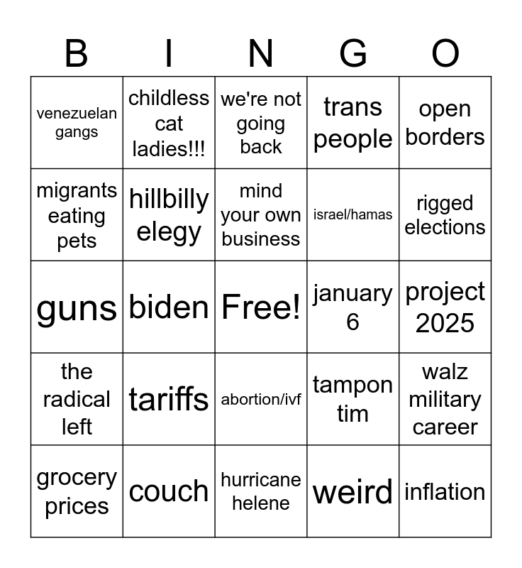 This bingo card has a free space and 24 words: tariffs, couch, mind your own business, grocery prices, open borders, venezuelan gangs, migrants eating pets, childless cat ladies!!!, january 6, abortion/ivf, israel/hamas, guns, tampon tim, walz military career, hillbilly elegy, weird, project 2025, we're not going back, rigged elections, biden, inflation, the radical left, trans people and hurricane helene.