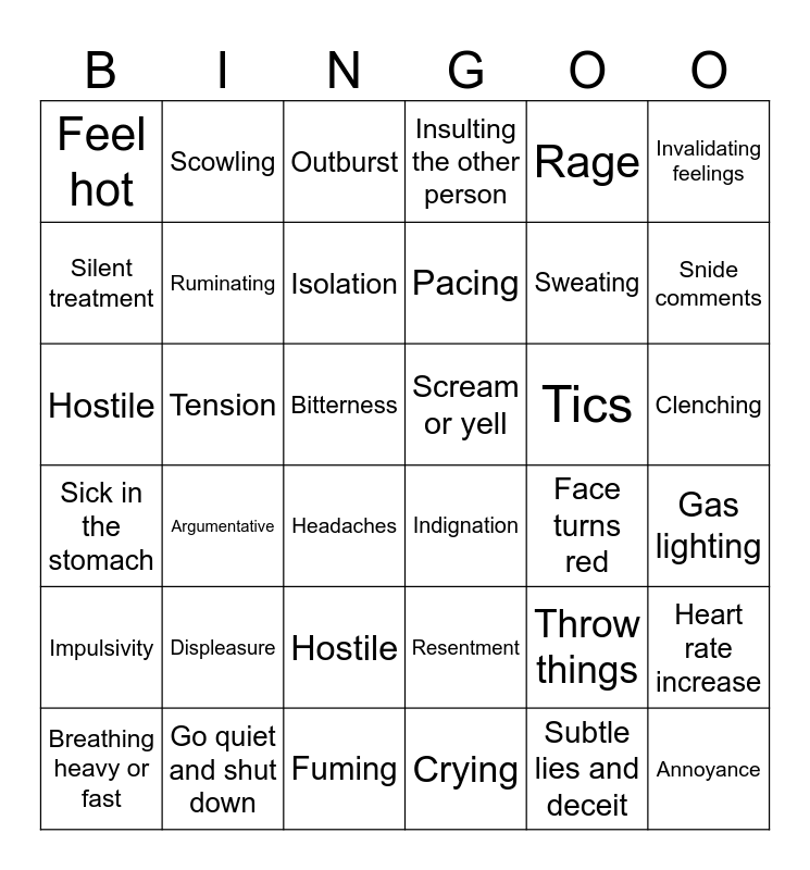 This bingo card has 43 words: Annoyance, Hostile, Agitation, Headaches, Resentment, Gas lighting, Outburst, Clenching my fists, Rage, Indignation, Insulting the other person, Tension, Clenching, Tics, Fuming, Face turns red, Heart rate increase, Sweating, Shaking hands or body, Pacing, Scowling, Breathing heavy or fast, Throw things, Feel hot, Pressure, Bitterness, Displeasure, Frayed nerves, Sick in the stomach, Scream or yell, Raise voice, Argumentative, Go quiet and shut down, Snide comments, Hostile, Crying, Impulsivity, Ruminating, Invalidating feelings, Isolation, Subtle lies and deceit, Silent treatment and Manipulation.