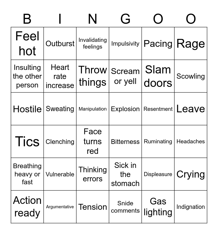 This bingo card has 53 words: Annoyance, Hostile, Agitation, Headaches, Resentment, Gas lighting, Outburst, Clenching my fists, Rage, Indignation, Insulting the other person, Tension, Clenching, Tics, Fuming, Face turns red, Heart rate increase, Sweating, Shaking hands or body, Pacing, Scowling, Breathing heavy or fast, Throw things, Feel hot, Pressure, Bitterness, Displeasure, Frayed nerves, Sick in the stomach, Scream or yell, Raise voice, Argumentative, Motivated to change, Go quiet and shut down, Snide comments, Crying, Impulsivity, Ruminating, Invalidating feelings, Isolation, Subtle lies and deceit, Silent treatment, Manipulation, Assertive, Burning bridges, Leave, Thinking errors, Action ready, Slam doors, Explosion, Attacking, Vulnerable and Hurt.