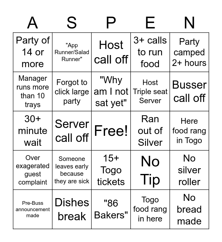 This bingo card has a free space and 24 words: Someone leaves early because they are sick, Dishes break, "Why am I not sat yet", Pre-Buss announcement made, Party camped 2+ hours, Party of 14 or more, Manager runs more than 10 trays, "App Runner/Salad Runner", Ran out of Silver, 15+ Togo tickets, Host Triple seat Server, 30+ minute wait, No Tip, No silver roller, Forgot to click large party, Togo food rang in here, Here food rang in Togo, Host call off, Busser call off, Server call off, No bread made, Over exagerated guest complaint, 3+ calls to run food and "86 Bakers".