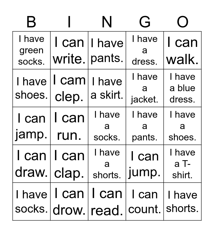 This bingo card has a free space and 24 words: I can clap., I can drow., I have a skirt., I have socks., I can walk., I have green socks., I have shoes., I can write., I have a pants., I have a shorts., I have a jacket., I can jamp., I can jump., I have a T-shirt., I cam clep., I can count., I have a shoes., I have pants., I have a blue dress., I can run., I have shorts., I can draw., I have a dress. and I can read..