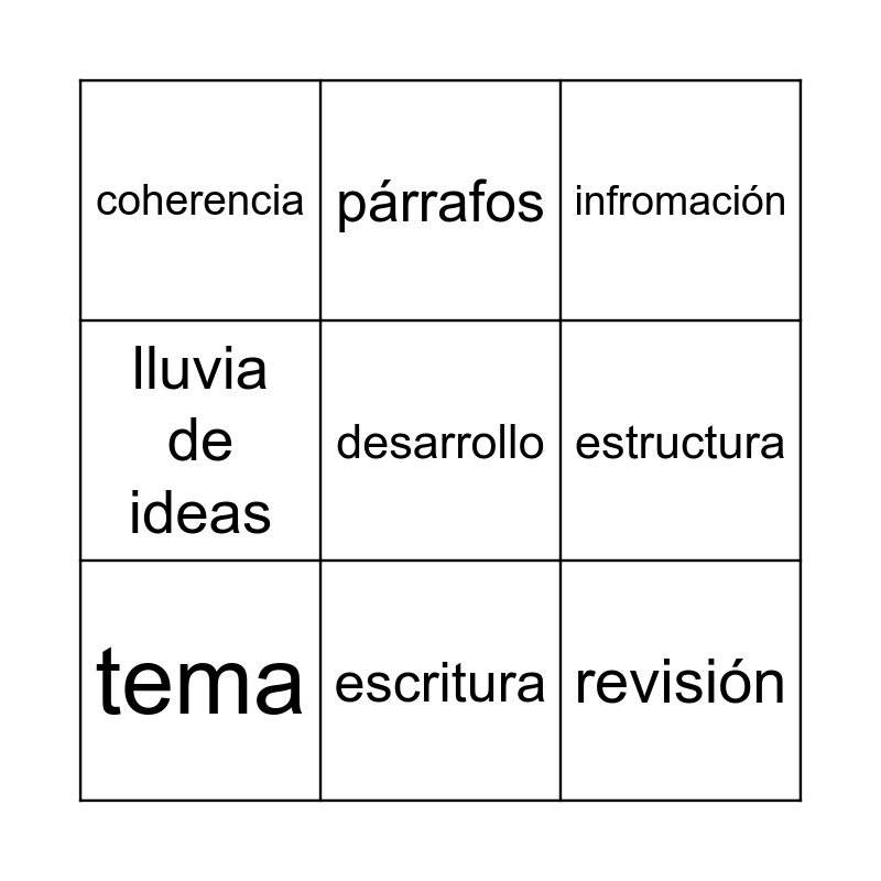 This bingo card has a free space and 14 words: ensayo, introducción, tema, párrafos, lluvia de ideas, revisión, investigar, conclusión, escritura, coherencia, orden, estructura, infromación and género literario.