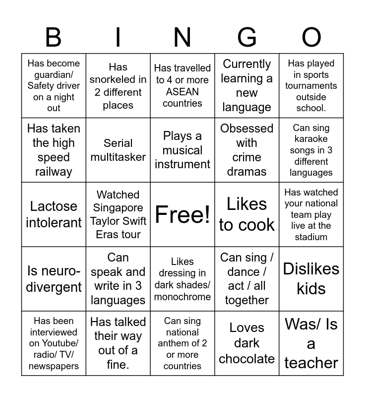 This bingo card has a free space and 24 words: Can speak and write in 3 languages, Has talked their way out of a fine., Plays a musical instrument, Has been interviewed on Youtube/ radio/ TV/ newspapers, Has played in sports tournaments outside school., Has become guardian/ Safety driver on a night out, Has taken the high speed railway, Has snorkeled in 2 different places, Likes to cook, Likes dressing in dark shades/ monochrome, Obsessed with crime dramas, Lactose intolerant, Can sing / dance / act / all together, Dislikes kids, Serial multitasker, Loves dark chocolate, Has watched your national team play live at the stadium, Has travelled to 4 or more ASEAN countries, Can sing karaoke songs in 3 different languages, Watched Singapore Taylor Swift Eras tour, Was/ Is a teacher, Is neuro-divergent, Currently learning a new language and Can sing national anthem of 2 or more countries.