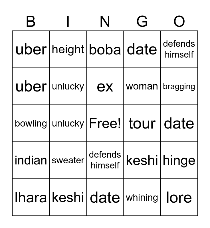 ⚠ This card has duplicate items: woman (3), lhara (3), indian (3), uber (3), date (3), okay, then (3), unlucky (3), bowling (2), height (2), defends himself (2), self boost (2), lore (2), tour (2), sweater (2), keshi (2), boba (2), flirting (2), ex (2), whining (2), trauma dump (2), bragging (2), story turns into self boost (2), hinge (2), abg (2)