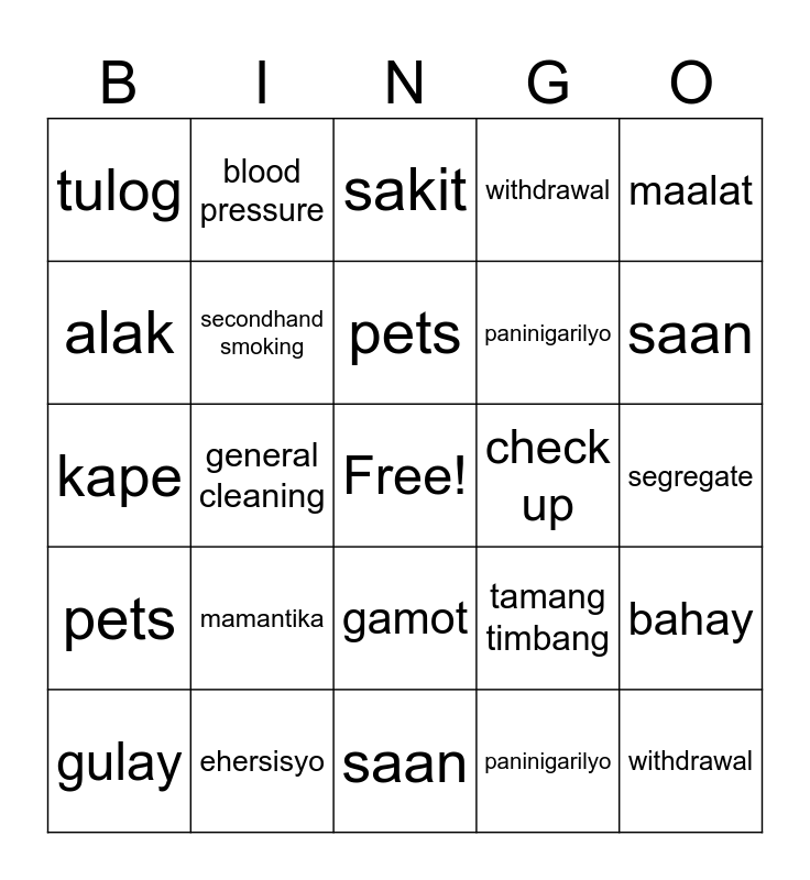 This bingo card has a free space and 24 words: mamantika, ehersisyo, pets, gulay, maalat, tulog, alak, blood pressure, check up, gamot, paninigarilyo, kape, tamang timbang, bahay, secondhand smoking, paninigarilyo, segregate, sakit, saan, general cleaning, withdrawal, pets, withdrawal and saan.