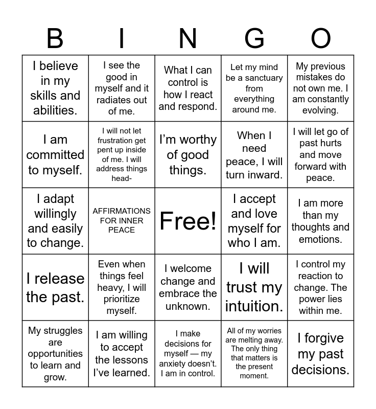 This bingo card has a free space and 25 words: Even when things feel heavy, I will prioritize myself., I make decisions for myself — my anxiety doesn’t. I am in control., I’m worthy of good things., My struggles are opportunities to learn and grow., My previous mistakes do not own me. I am constantly evolving., I believe in my skills and abilities., I am committed to myself., I see the good in myself and it radiates out of me., I accept and love myself for who I am., I welcome change and embrace the unknown., When I need peace, I will turn inward., I adapt willingly and easily to change., I will trust my intuition., I control my reaction to change. The power lies within me., I will not let frustration get pent up inside of me. I will address things head-, I can release what I’m meant to let go of., I am more than my thoughts and emotions., What I can control is how I react and respond., I will let go of past hurts and move forward with peace., AFFIRMATIONS FOR INNER PEACE, I forgive my past decisions., I am willing to accept the lessons I’ve learned., I release the past., Let my mind be a sanctuary from everything around me. and All of my worries are melting away. The only thing that matters is the present moment..