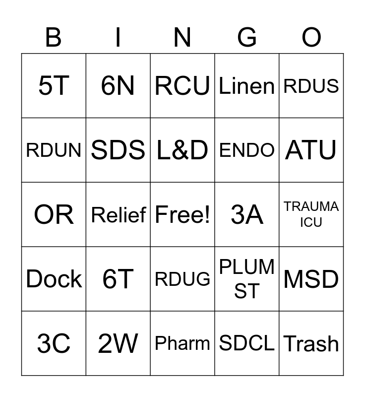 This bingo card has a free space and 24 words: 6T, 2W, L&D, 3C, RDUS, 5T, RDUN, 6N, 3A, RDUG, ENDO, OR, PLUM ST, MSD, SDS, SDCL, TRAUMA ICU, RCU, ATU, Relief, Trash, Dock, Linen and Pharm.