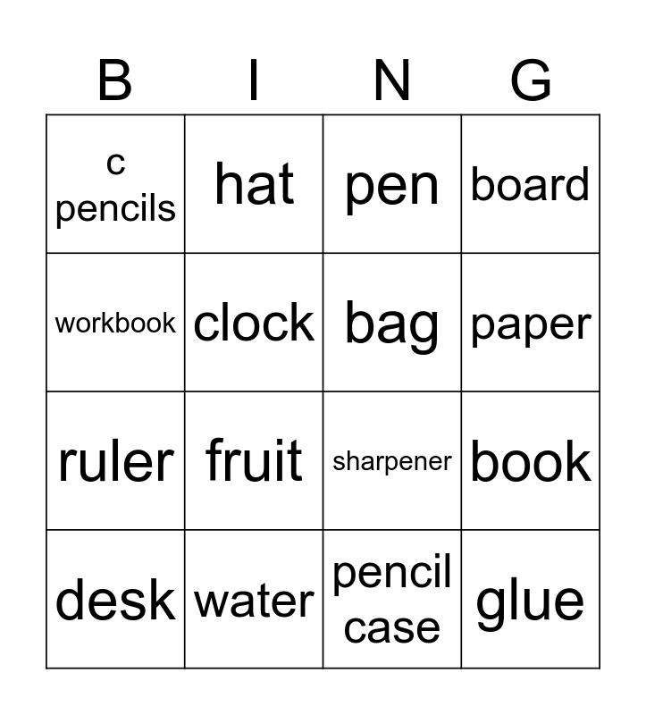 This bingo card has 16 words: water, book, pen, c pencils, ruler, hat, sharpener, pencil case, workbook, clock, desk, board, fruit, paper, bag and glue.