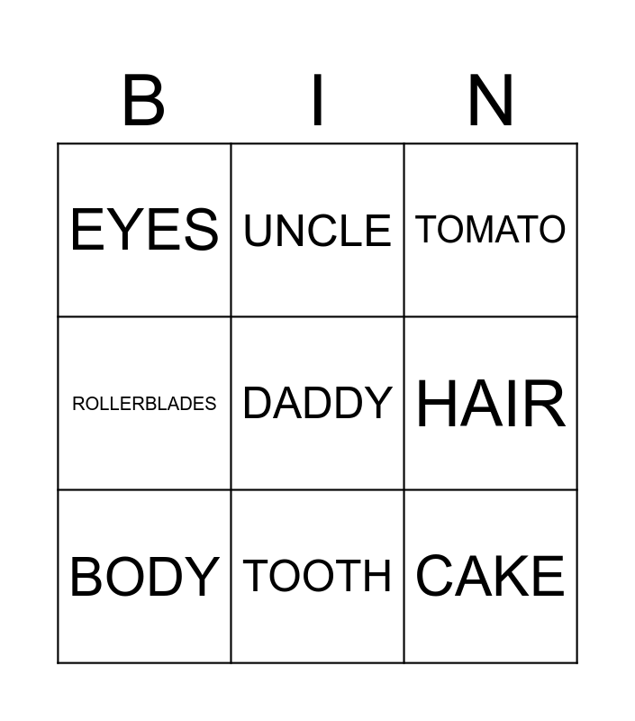 This bingo card has a free space and 24 words: FOOT, GRANDMA, TOOTH, BREAD, CAKE, EYES, HAIR, UNCLE, SISTER, CHEESE, HAND, MOUTH, BROTHER, TEDDY BEAR, BODY, HEAD, FRUIT, TOMATO, NOSE, EARS, FINGER, APPLE, ROLLERBLADES and DOLL.