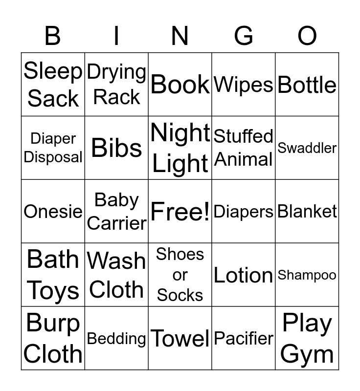 This bingo card has a free space and 24 words: Wash Cloth, Bedding, Night Light, Burp Cloth, Bottle, Sleep Sack, Diaper Disposal, Drying Rack, Diapers, Shoes or Socks, Stuffed Animal, Onesie, Lotion, Shampoo, Bibs, Pacifier, Blanket, Book, Swaddler, Baby Carrier, Play Gym, Bath Toys, Wipes and Towel.