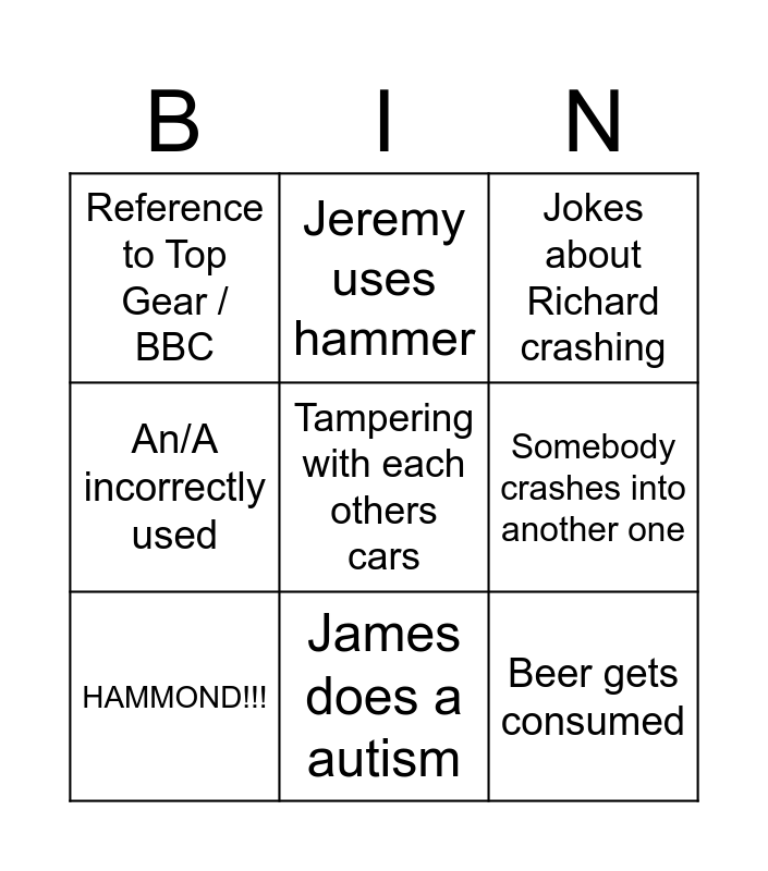 This bingo card has 9 words: HAMMOND!!!, Jokes about Richard crashing, Jeremy uses hammer, An/A incorrectly used, Reference to Top Gear / BBC, Somebody crashes into another one, Tampering with each others cars, Beer gets consumed and James does a autism.