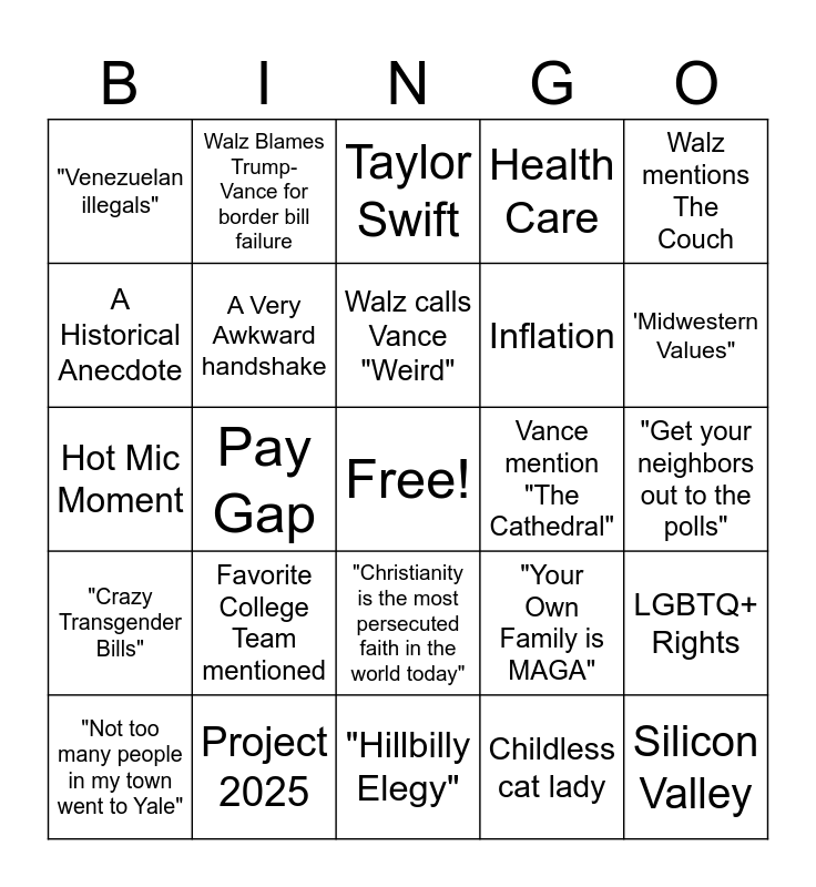 This bingo card has a free space and 34 words: Peter Thiel gets namedropped, Childless cat lady, Diet Mountain Dew, Walz mentions he was a coach or teacher, "Crazy Transgender Bills", A Very Awkward handshake, Walz mentions The Couch, "Not too many people in my town went to Yale", Walz Blames Trump-Vance for border bill failure, Vance say democratic rhetoric encouraged assassination attempts, Walz calls Vance "Weird", Taylor Swift, Vance use the word "Stolen Valor", Someone brings up eating pets, Vance mention "The Cathedral", 'Midwestern Values", Project 2025, Hot Mic Moment, Favorite College Team mentioned, "Your Own Family is MAGA", "Christianity is the most persecuted faith in the world today", Walz calls Vance "Son", "Venezuelan illegals", "Get your neighbors out to the polls", "Hillbilly Elegy", Silicon Valley, Health Care, Kamala Harris, Inflation, A Historical Anecdote, "Per the rules of the debate", Pay Gap, LGBTQ+ Rights and Fact Check.