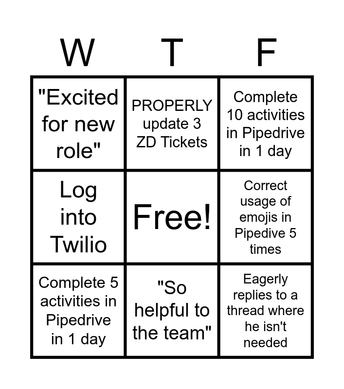 This bingo card has a free space and 8 words: Log into Twilio, PROPERLY update 3 ZD Tickets, Correct usage of emojis in Pipedive 5 times, Complete 5 activities in Pipedrive in 1 day, Complete 10 activities in Pipedrive in 1 day, "Excited for new role", "So helpful to the team" and Eagerly replies to a thread where he isn't needed.