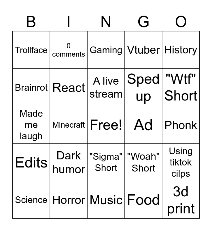 This bingo card has a free space and 34 words: Roblox, Food, Vlog, Anime, Edits, React, History, Science, 0 comments, A famous streamer, A live stream, Gaming, Cringe, Promo, Ad, "Wtf" Short, Horror, Made me laugh, Dark humor, "Woah" Short, "Sigma" Short, 😐, Trollface, Phonk, Music, 3d print, Vtuber, Memes, Sped up, Brainrot, Losing brain cells, Minecraft, Using tiktok cilps and Gym.