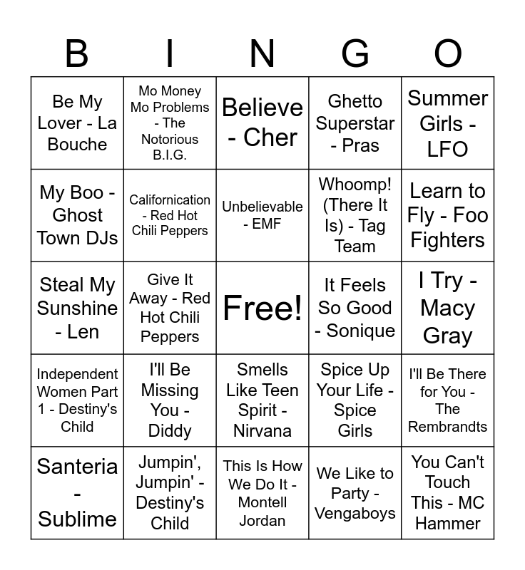 This bingo card has a free space and 50 words: Good Vibrations - Marky Mark and the Funky Bunch, You Can't Touch This - MC Hammer, Here Comes the Hotstepper - Ini Kamoze, This Is How We Do It - Montell Jordan, I'll Be Missing You - Diddy, Blue - Eiffel 65, Mo Money Mo Problems - The Notorious B.I.G., Ready or Not - Fugees, My Boo - Ghost Town DJs, S sButterfly - Crazy Town, Californication - Red Hot Chili Peppers, Ghetto Superstar - Pras, I'll Be There for You - The Rembrandts, Spice Up Your Life - Spice Girls, Pretty Fly for a White Guy - The Offspring, C'est La Vie - Bewitched, Unbelievable - EMF, It Feels So Good - Sonique, (You Drive Me) Crazy - Britney Spears, Summer Girls - LFO, Give It Away - Red Hot Chili Peppers, We Like to Party - Vengaboys, Be My Lover - La Bouche, Whoomp! (There It Is) - Tag Team, Gettin' Jiggy wit It - Will Smith, Fly - Sugar Ray, Learn to Fly - Foo Fighters, Can't Get Enough of You Baby - Smash Mouth, Believe - Cher, Smells Like Teen Spirit - Nirvana, Fantasy - Mariah Carey, Maria Maria - Santana, Come on Over Baby (All I Want Is You) - Christina Aguilera, Waterfalls - TLC, Jumpin', Jumpin' - Destiny's Child, Tearing Up My Heart - *NSYNC, Mambo No. 5 (A Little Bit of...) - Lou Bega, Creep - TLC, Scar Tissue - Red Hot Chili Peppers, I Try - Macy Gray, Losing My Religion - R.E.M., My Own Worst Enemy - Lit, Thunderstruck - AC/DC, Under the Bridge - Red Hot Chili Peppers, Santeria - Sublime, Steal My Sunshine - Len, Thank You - Dido, Remember the Time - Michael Jackson, Independent Women Part 1 - Destiny's Child and Two Princes - Spin Doctors.
