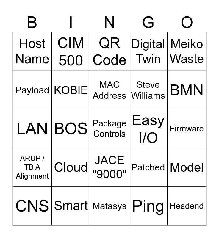 This bingo card has 37 words: Free!, Device Qualification, DBRS, KOBIE, Model, Cloud, MAC Address, Single Pane Of Glass, Meiko Waste, IB, BOS, Digital Twin, Package Controls, Firmware, Payload, ARUP / TB A Alignment, EMS, QR Code, JACE "9000", Easy I/O, Host Name, BMN, CNS, Matasys, Dashboard, Ping, CIM 500, Modbus Register, Instance Numbers, IOT, Close To The Edge, Smart, LAN, Headend, Patched, Steve Williams and Manit.