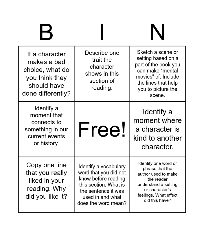 This bingo card has a free space and 11 words: Describe a funny scene or moment., Identify a vocabulary word that you did not know before reading this section. What is the sentence it was used in and what does the word mean?, Identify one word or phrase that the author used to make the reader understand a setting or character’s feelings. What effect did this have?, Copy one line that you really liked in your reading. Why did you like it?, Describe one trait the character shows in this section of reading., Sketch a scene or setting based on a part of the book you can make “mental movies” of. Include the lines that help you to picture the scene., Identify a moment where a character is kind to another character., Identify a moment where you can connect with the character., Identify a moment that connects to something in our current events or history., If a character makes a bad choice, what do you think they should have done differently? and FREE.