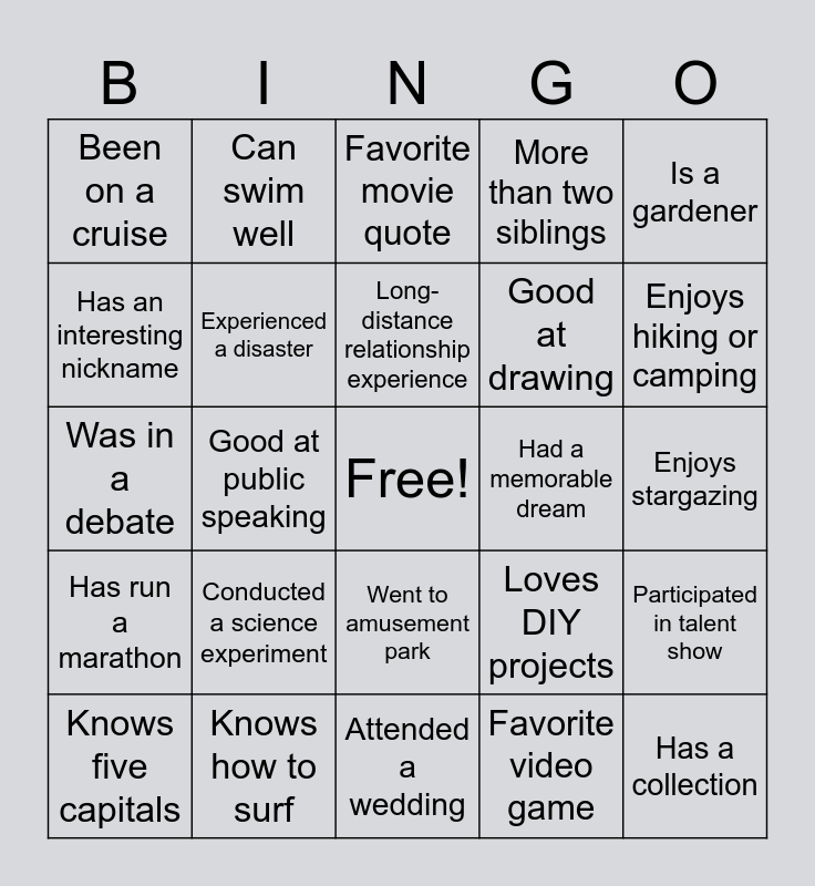 This bingo card has a free space and 132 words: Has traveled abroad, Speaks multiple languages, Is left-handed, Plays a musical instrument, Has unique hobby, Is the youngest sibling, Has run a marathon, Loves spicy food, Met a celebrity, Has been on TV, Can do a cartwheel, Loves pineapple pizza, Lived in three cities, Has broken a bone, Birthday in October, Is an only child, Prefers tea over coffee, Speaks a dialect, Never flown on a plane, Afraid of heights, Worked in retail, Knows how to surf, Has a collection, Can cook from scratch, Went skydiving before, Learning a new skill, Long-distance relationship experience, Regular volunteer, Loves horror movies, Traveled solo, Good at drawing, Can swim well, Participated in talent show, Enjoys hiking or camping, Has a tattoo, Attended a concert, Prefers reading to TV, Was a student officer, Wrote a story, Can play chess, More than two siblings, Is a morning person, Loves K-pop or anime, Can dance ballroom, Is ambidextrous, Runs a side business, Prefers beach to mountains, Performed on stage, Visited 10 provinces, Is a gardener, Drives a car, Went scuba diving, Scared of insects, Joined a protest, Knows how to sew, Enjoys baking desserts, Worked fast food, Prefers winter season, Has a favorite quote, Good at public speaking, Was in a debate, Enjoys watching sports, Can recite tongue twisters, Loves board games, Favorite movie series, Part of a sports team, Knows how to juggle, Good at impressions, Writes in a journal, Has an interesting nickname, Loves savory food, Went to amusement park, Has a hidden talent, Enjoys themed parties, Danced in a competition, Saw a shooting star, Favorite superhero, Tries new foods, Can recite a poem, Attended a film festival, Favorite childhood game, Traveled by train, Knows all continents, Enjoys stargazing, Attended a music festival, Visited a historical site, Knows how to code, Made a viral video, Played a character, Joined a choir, Experienced a disaster, Took a cooking class, Collects action figures, Attended a wedding, Loves puzzles, Can whistle tunes, Camped under stars, Tried extreme sports, Joined a cleanup, Makes cocktails, Favorite movie quote, Loves DIY projects, Conducted a science experiment, Plays multiplayer games, Attended a cultural festival, Wrote a letter to self, Visited a national park, Is a photographer, Favorite guilty pleasure, Been in a car accident, Loves history, Favorite video game, Went to a zoo, Tried meditation, Has a favorite animal, Can name African countries, Took a road trip, Can touch toes easily, Favorite ice cream flavor, Met a psychic, Plays trivia games, Made a scrapbook, Knows planets' names, Been on a cruise, Wrote a pen pal letter, Had a memorable dream, Knows five capitals, Can sing well, Has a favorite band, Loves to travel, Has a secret talent and Is a foodie.