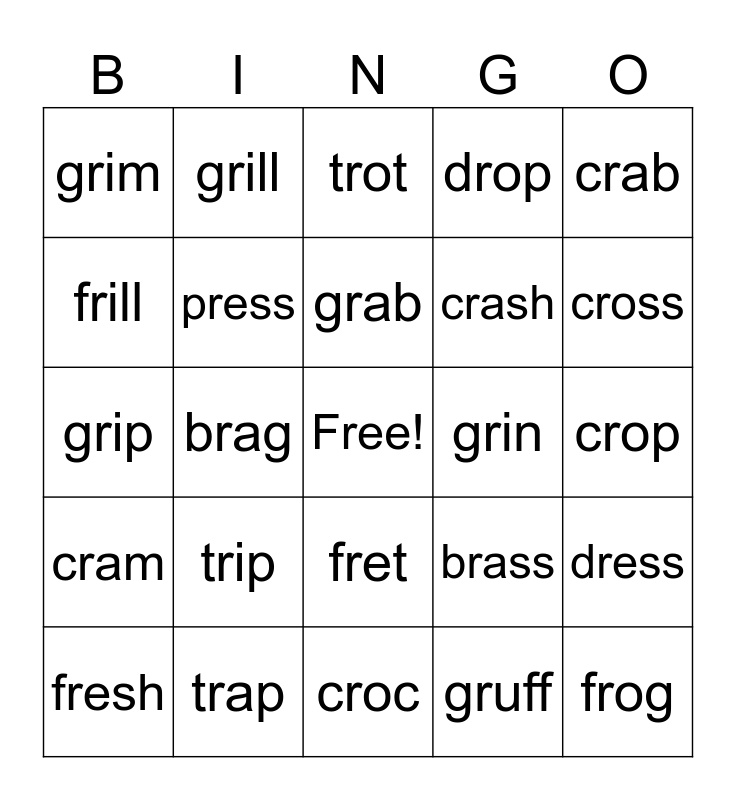 This bingo card has a free space and 24 words: trip, trap, grab, fresh, crab, grim, frill, grill, grin, fret, crash, grip, brass, dress, press, gruff, crop, trot, cross, brag, frog, cram, drop and croc.