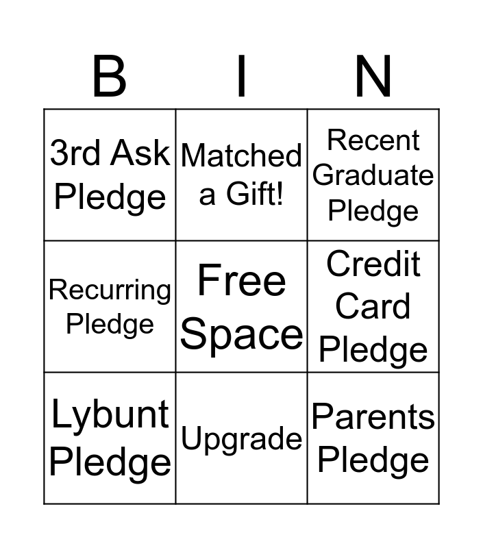 This bingo card has a free space and 8 words: Credit Card Pledge, Recent Graduate Pledge, Matched a Gift!, Lybunt Pledge, 3rd Ask Pledge, Parents Pledge, Recurring Pledge and Upgrade.