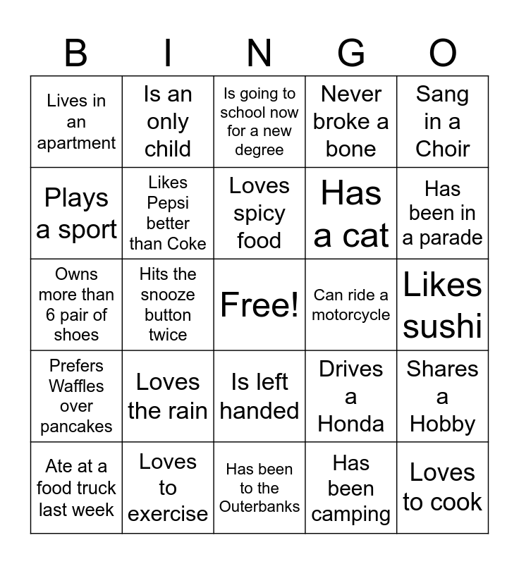 This bingo card has a free space and 64 words: Likes to Read, Loves Fall and PSL, Is from Charlotte, Shares a Hobby, Has been to more than 4 different countries, Is a morning person, Is an only child, Does not use Facebook or Instagram, Loves spicy food, Cannot ride a bicycle, Is left handed, Plays a musical Instrument, Likes sushi, Sang in a Choir, Can speak more than one language, Plays a sport, Hits the snooze button twice, Lives in an apartment, Likes Chocolate, Has a cat, Loves the rain, Prefers Waffles over pancakes, Never broke a bone, Doesn't drink coffee, Favorite color is Green, Is wearing black socks, Has a little brother, Has more than 2 children, Has an Iphone, Has 2 Degrees, Owns a blue or red car, Has never been to Atlanta, Shares a birth month with you, Went to the beach this year, Has been in a parade, Ate at a food truck last week, Has an office playlist, Has been camping, Went to a concert this year, Likes Pepsi better than Coke, Owns more than 6 pair of shoes, Can ride a motorcycle, Has more than 500 unread emails, Went to a movie theater this summer, Has a pet that is not a dog or a cat, Loves to cook, Loves to exercise, Loves to read, Drives a Honda, Has never had a Big Mac, Has a fun Hobby, Has been to Mt Mitchell, Has been to the Outerbanks, Has been to California, Has been to Times Square, Went to school in NC, Is going to school now for a new degree, Has a library Card, Plays video games, Shares your astrology sign, Worked at an airport, Loves rollercoasters, Wear the same shoe size as you and Is wearing more than one ring.
