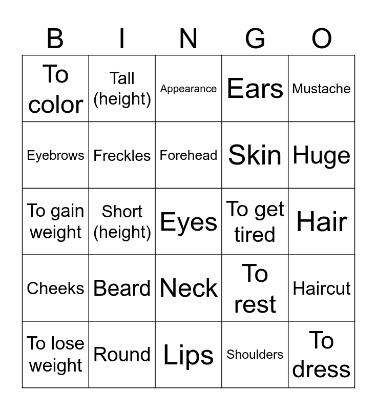 This bingo card has a free space and 24 words: Beard, Round, Forehead, To lose weight, Mustache, To color, Eyebrows, Tall (height), To get tired, Neck, Skin, To gain weight, To rest, Haircut, Freckles, Shoulders, Hair, Appearance, Huge, Short (height), To dress, Cheeks, Ears and Lips.