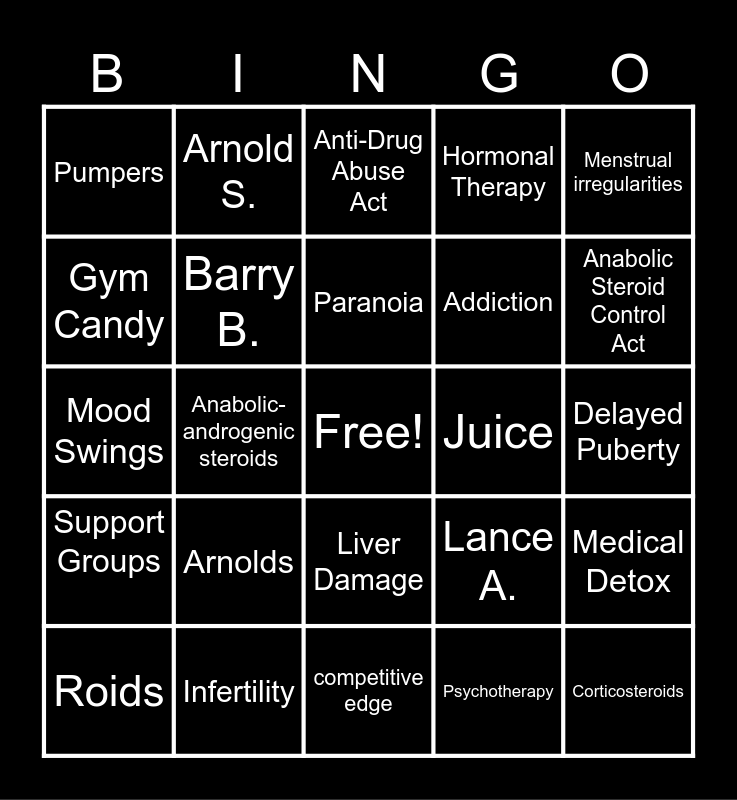 This bingo card has a free space and 24 words: Arnolds, Infertility, Paranoia, Roids, Menstrual irregularities, Pumpers, Gym Candy, Arnold S., Juice, Liver Damage, Addiction, Mood Swings, Lance A., Medical Detox, Barry B., Psychotherapy, Delayed Puberty, Anti-Drug Abuse Act, Anabolic Steroid Control Act, Anabolic-androgenic steroids, Corticosteroids, Support Groups, Hormonal Therapy and competitive edge.