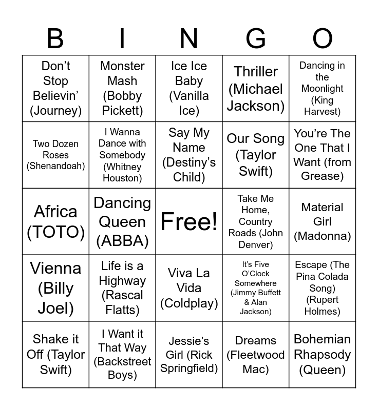 This bingo card has a free space and 29 words: Shake it Off (Taylor Swift), Firework (Katy Perry), Dancing Queen (ABBA), Sweet Caroline (Neil Diamond), Don’t Stop Believin’ (Journey), Ice Ice Baby (Vanilla Ice), I Wanna Dance with Somebody (Whitney Houston), Life is a Highway (Rascal Flatts), Take Me Home, Country Roads (John Denver), I Want it That Way (Backstreet Boys), Material Girl (Madonna), Bohemian Rhapsody (Queen), Jessie’s Girl (Rick Springfield), Dreams (Fleetwood Mac), You’re The One That I Want (from Grease), I’ll Be There For You (theme from Friends), Viva La Vida (Coldplay), Vienna (Billy Joel), Dancing in the Moonlight (King Harvest), Africa (TOTO), It’s Five O’Clock Somewhere (Jimmy Buffett & Alan Jackson), I Like It, I Love It (Tim McGraw), Our Song (Taylor Swift), Two Dozen Roses (Shenandoah), Thriller (Michael Jackson), Monster Mash (Bobby Pickett), Escape (The Pina Colada Song) (Rupert Holmes), Say My Name (Destiny’s Child) and Poker Face (Lady Gaga).
